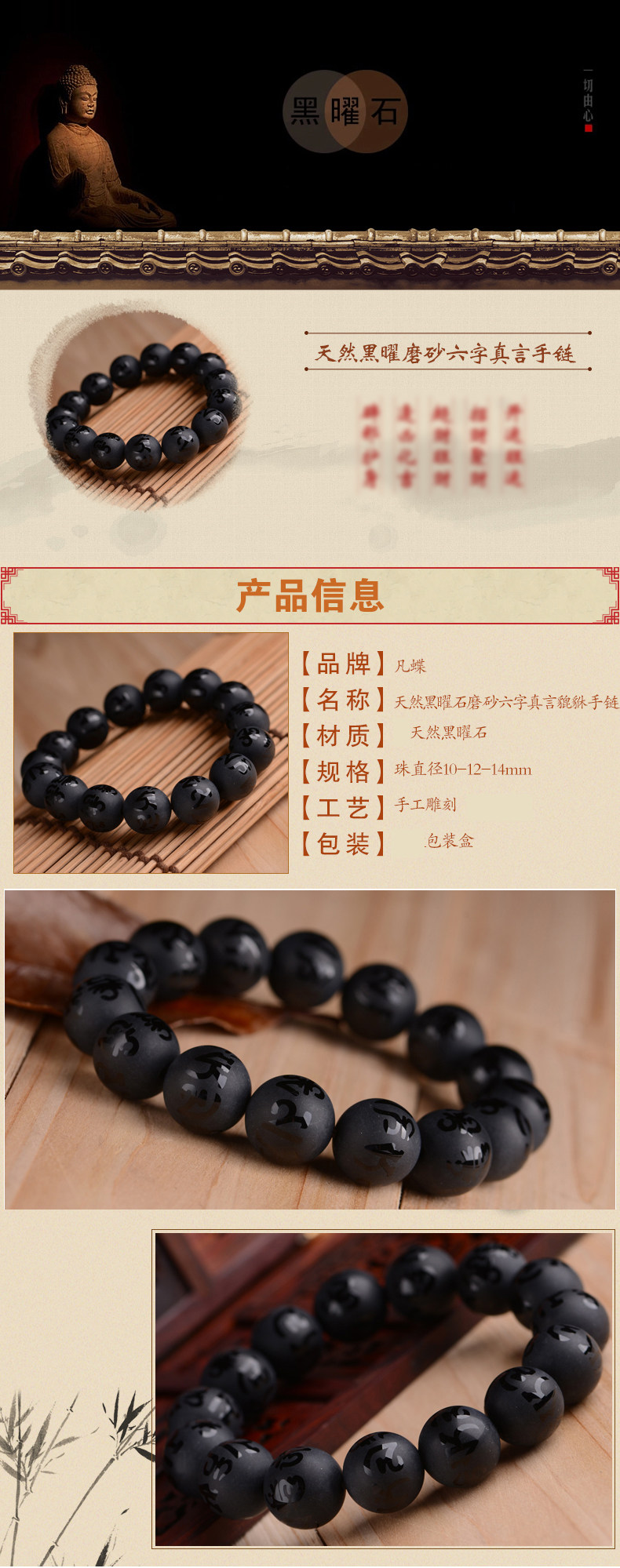 天然黑曜石六字真言手链 天然水晶手串饰品女男士 本命年