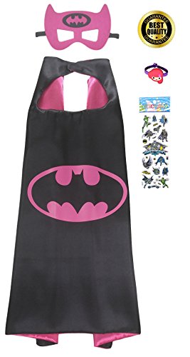 REWARD YOUR KID: Gift your kids with the Batgirl costume; they will be so happy playing the role of their favorite superhero. Allow your child to pick who she wants to be for the day. ACCESSORIES ITEMS: In addition of getting a Superhero Cape & Mask they will get a wonderful power girl bracelet and a superhero sticker for their complete enjoyment. When your kid opens this gift, she will be delightful and happy with their superhero gear and all the accessories - it will feel just like Christmas all over again! SIZE SPECIFICATIONS: Capes are approximately 24" tall by 26" wide. MATERIALS: Capes are made of double-sided satin. Much higher quality than some of the other options on the market. These are made to last. The logos are screen printed on and will maintain their vibrant color, if given proper care, even after years of wear. Velcro neck fastener make it easy to take on and off. Masks are made of high quality felt. An elastic band makes the masks adjustable to multiple head sizes. CARE INSTRUCTIONS: For the best look possible, all capes should be ironed on VERY LOW heat before use. Capes should be hand washed in cold water and air dried. Headband should be wiped clean with a damp towel.Feature