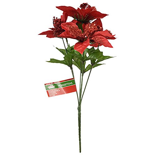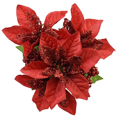 6pc Christmas House Fake Flowers Holiday, 5-Stem Glittery Red Poinsettias, 14.5 in