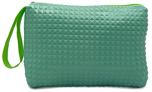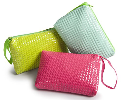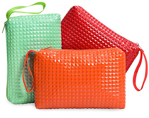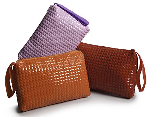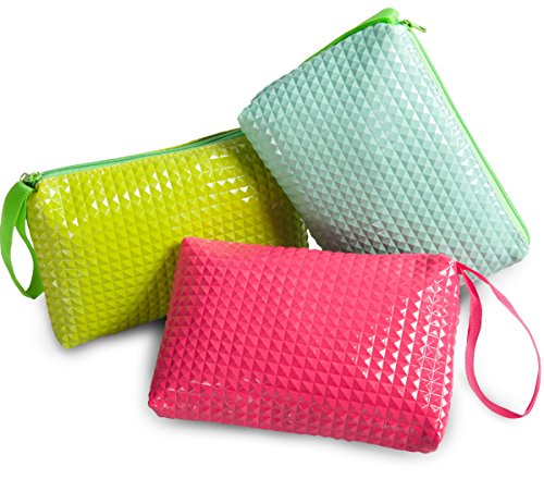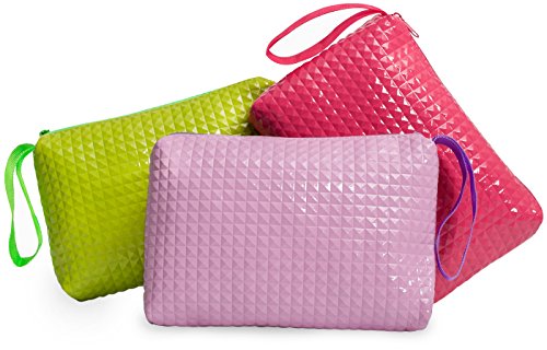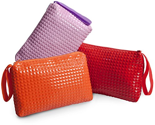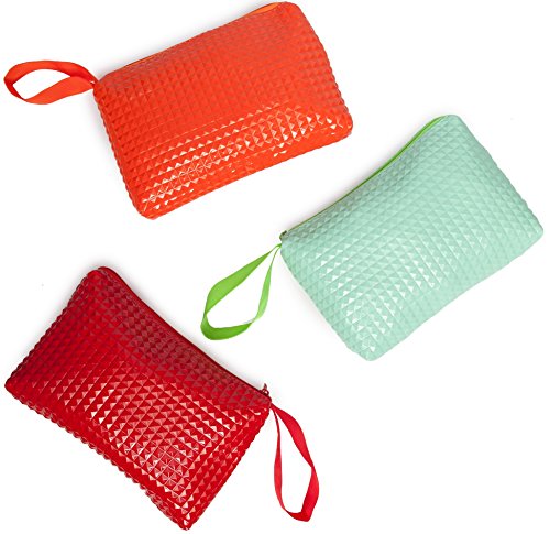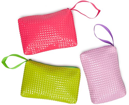 Product Description If you find it hard to organize the small stuff, these colorful zipper bags with a unique 3d rivet pattern keep your everyday items in place. Each pack consists of three bags each with single compartment. It is ideal for checkbook, small valuables, school and craft supplies, tools, pens, kids crayons, pencils and markers. Also for medicines, eyewear, first aid items, a small camera, contact lenses, receipts, manicure accessories, nail polish, lipstick, gear and various supplies. Just wipe with a wet cloth to keep clean. Each bag measure 5x8 inches and is 1 inch wide. 0