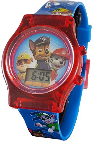 This watch is perfect for any little child. It features a soft plastic band that will adjust to your child's wrist(5-6.5 inches) with 7 holes and a plastic buckle clasp. The best feature of this watch is when you press the right corner button the entire face of the watch will start flashing colors in red and yellow. Your child's friends will not be able to take their eyes off of this watch. The watch also comes in a Paw Patrol gift box.Feature