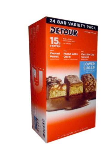 -. Feature : 24 Detour Bars, Low Sugar Whey Protein Bars, 1.5oz Bars. / 15 grams of protein per bar / 50% less sugar than regular Caramel Nut Detour bars / 8 Caramel Peanut, 8 Peanut Butter Cream and 8 Chocolate Chip Caramel Bars