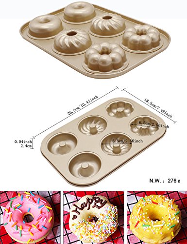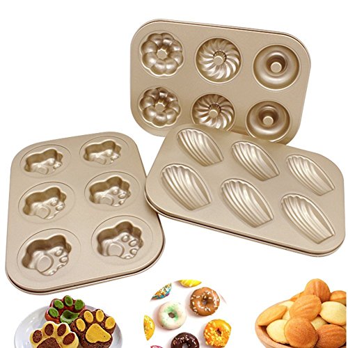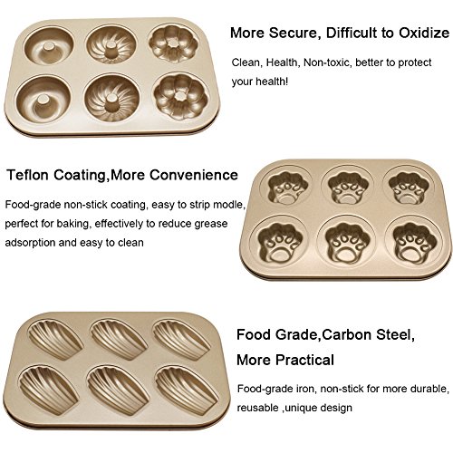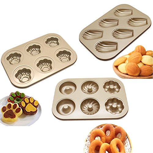 Upintek Nonstick 6-Cavity Mini Donut Pan, Carbon Steel Multi-shape Cake Baking Pan, Madeleine Pan, Paw Print Pan for Mini Cake Making (3Packs)