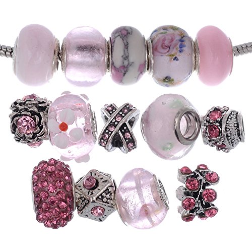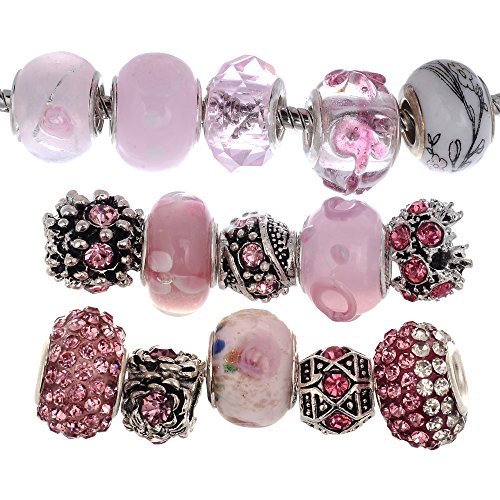 RUBYCA Murano Lampwork Charm Glass Beads Tibetan Crystal European Bracelet Mix Assortment Pink 15Pcs
