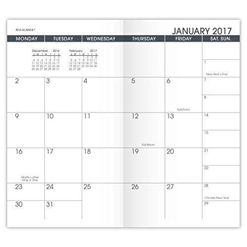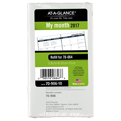 -. Binding : Office Product -. Brand : At-A-Glance -. Color : white -. EAN : 0038576266476 -. Feature : Renew your monthly planner with this refill set. 13 months of planning pages from January - January for a full year of monthly planning. / One month per two page spread features unruled daily blocks to provide plenty of space for notes / Each week starts on Monday with split Saturday and Sunday to keep the focus on the work week / Past and future months reference calendars also included on each monthly spread for quick date checking / Quality paper resists ink bleed and contains 30% post consumer waste recycled material. Refill pages only; planner cover sold separately. Fits item 70-064. 3.63 in. x 6.13 in. page size. -. Label : ACCO Brands -. Manufacturer : ACCO Brands -. Model : 7090610-17 -. MPN : 7090610-17 -. NumberOfItems : 1 -. PackageQuantity : 1 -. PartNumber : 7090610-17 -. ProductGroup : Office Product -. ProductTypeName : OFFICE_PRODUCTS -. Publisher : ACCO Brands -. Studio : ACCO Brands -. Title : AT-A-GLANCE Monthly Planner / Appointment Book 2017, Refillable, 3-1/2 x 6-1/8", White(7090610) -. UPC : 038576266476