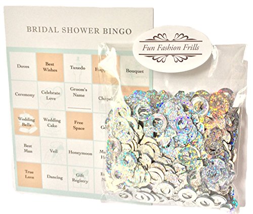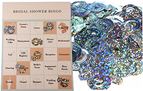 BRIDAL SHOWER BINGO CHIPS DOUBLES AS WEDDING TABLE CONFETTI. Get more bang for your buck! Add a shimmering glow to decorate your bridal shower, bachelorette party and wedding reception tables. Our wedding confetti, with its silver holographic flat surface and faceted diamond design is perfect when adding to wedding gift bags and invitations too. Each bag of confetti weighs 2.5 oz. That is approximately 600-700 confetti pieces!
