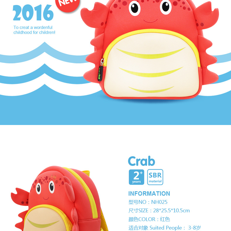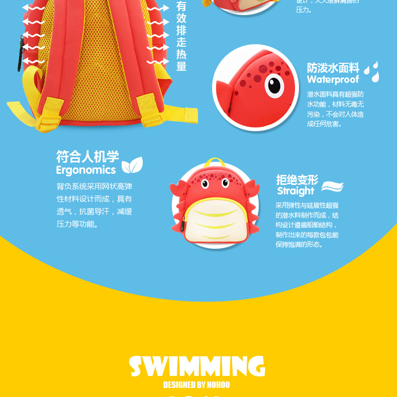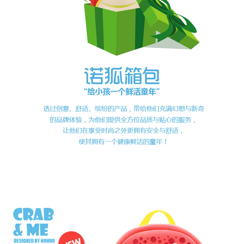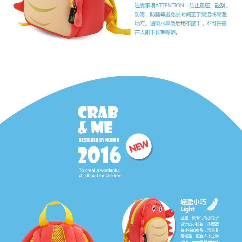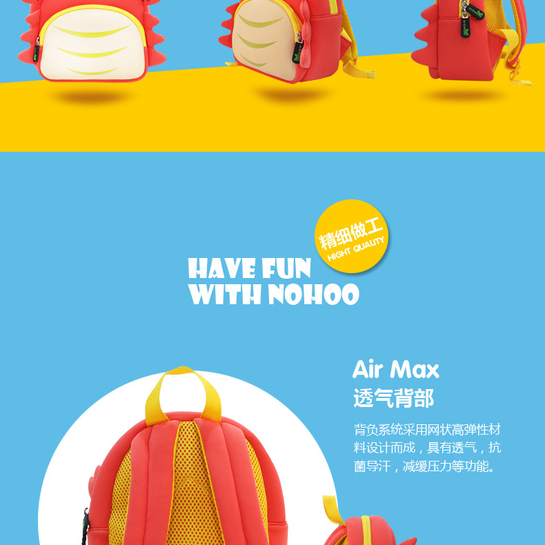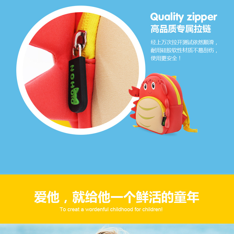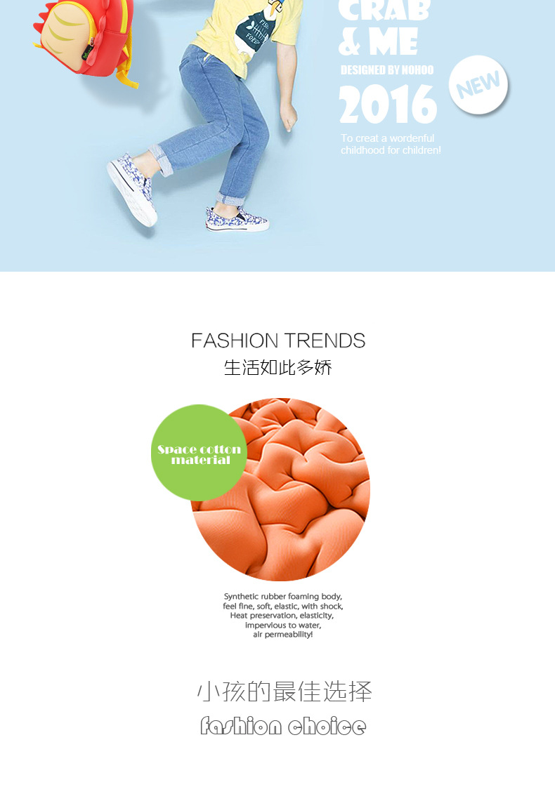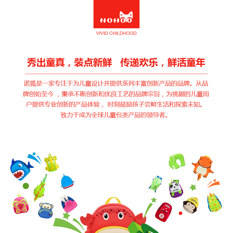 诺狐采用独特的Neoprene潜水料,有别于一般材质,潜水料具有良好的柔软性与弹性,防水防潮,质地轻盈等特点,有适用于专业潜水衣及各种运动领域,其立体塑形极具个性的特性更风靡时尚圈。诺狐童包独特的设计与良好的材质有别于一般的儿童包,立体结构剪裁,鲜艳大胆的配色,打材料的特性发挥到淋漓尽致,为我们的用户提供缤纷、舒适、健康的产品体验。