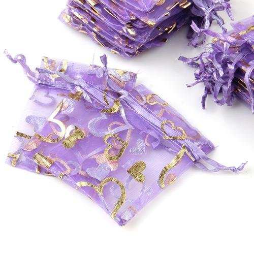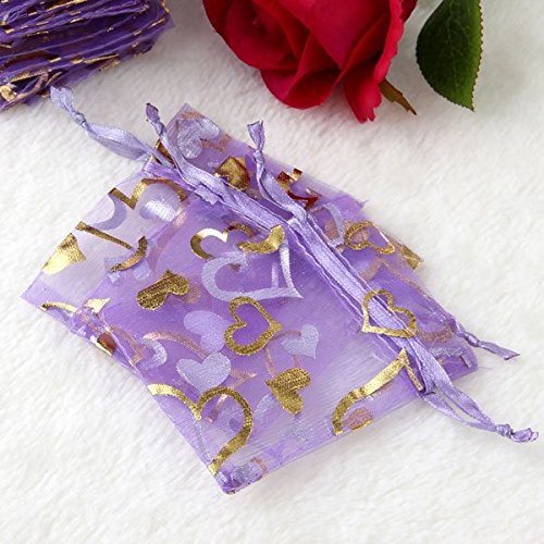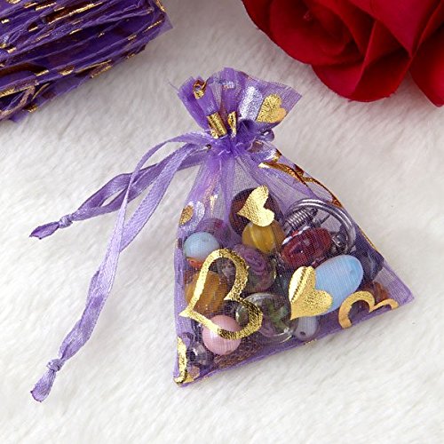 ECLOUD SHOP® 50 PURPLE ORGANZA GOLD HEART DRAWSTRING GIFT JEWELRY POUCHES BAGS WEDDING HOT