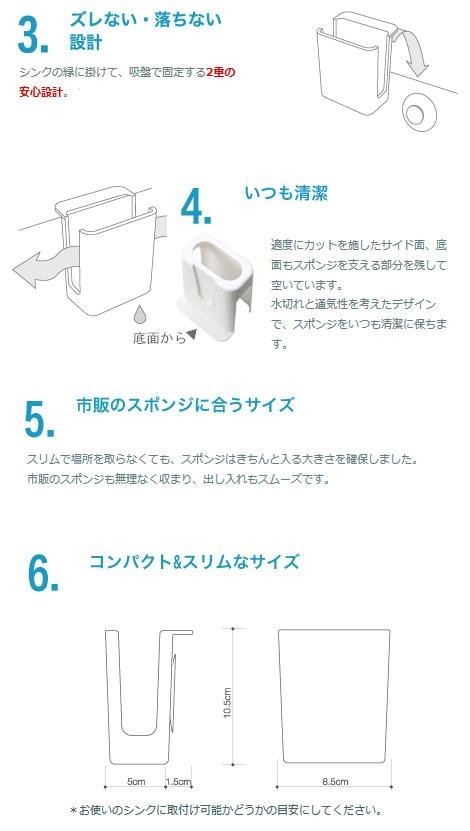 サイドをカットしたデザインによって、水切れ・通気性がよく、いつもスポンジを清潔に保てます。フックと吸盤2重で固定するので、ズレない・落ちない設計です。一生懸命働いてお疲れ気味のスポンジ・・・まだ使えるけど見た目が気になるときは、これでスッポリ隠せます!! |