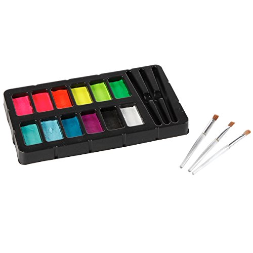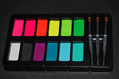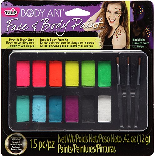 -. Binding : Office Product -. Brand : Tulip -. Color : Assorted -. Feature : Includes 12 colors and 3 application brushes / Paints activate with water / Create unique outstanding blacklight effects. Blacklight ONLY. Does NOT glow int he dark! / .42oz total net volume. Washes off with soap and water / Black and white colors do not glow in blacklight -. Label : Tulip -. Manufacturer : Tulip -. Model : 32388 -. PackageQuantity : 1 -. ProductGroup : Art and Craft Supply -. ProductTypeName : ART_SUPPLIES -. Publisher : Tulip -. Studio : Tulip -. Title : Tulip Blacklight Reactive Body Art Face & Body Paint Palette 15pcs