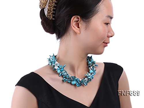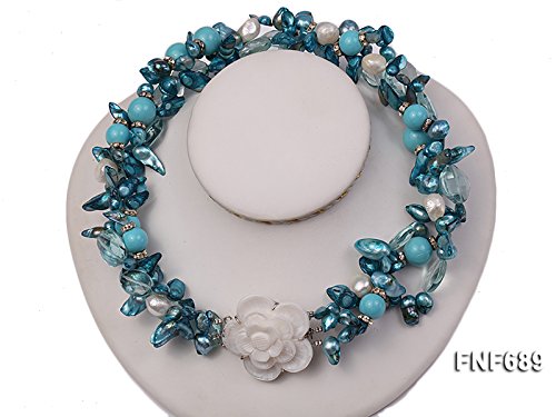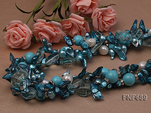 Description *This is a very pretty three-strand necklace, set with 12x20mm blue tooth-shaped cultured freshwater pearls, 12mm and 14mm round blue turquoise beads, 12mm baroque freshwater pearls and 13x18mm light-blue oval faceted crystals.
