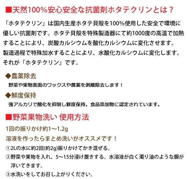 | 残留農薬、防腐剤、ワックス、大腸菌などを除菌、除去します。国内生産ホタテ貝殻を100%使用した環境にやさしい抗菌剤です。簡単な扱いで手軽に使用可能です。 |