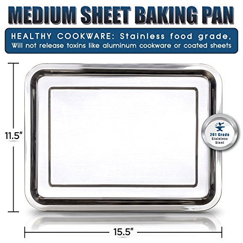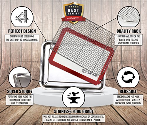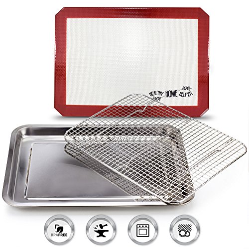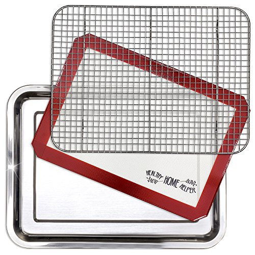 Stainless Steel Sheet Pan 15.5" by 11.5" & Cooling Rack & Silicone Baking Mat Set (3 Pcs) - Extra Durable Cookie Sheet, Oven Safe non-toxic heavy duty Bakeware. by Healthy Home Helper