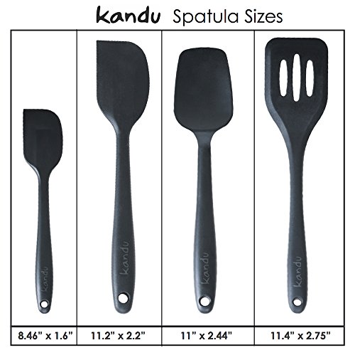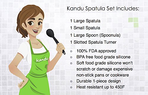 -. Feature : HIGH HEAT 450°F PRO-GRADE SILICON - BPA Free and FDA Approved Silicone is Safe for Coated & Non-stick Cookware. / DISHWASHER SAFE - All pieces made out of ONE PIECE SILICONE construction. Set contains 1pc Spoon Spatula Spoonula (11" x 2.4" ), 2 pcs Regular Spatulas (11.2" x 2.2" and 8" x 1.7"), 1pc Slotted Turner Scraper (11.4" x 2.8" ) / FLEXIBLE SILICONE HEAD WITH SOLID STEEL CORE - Silicone won't discolor, warp, melt, crack or break like plastic or wooden spatulas; One piece design aid with comfort grip; Solid silicone surface means no crevices for bacteria to collect; Easy to use; Easy to clean. Best possible for home kitchen, cookhouse, bakehouse, camping, hiking or professional chef. / SILICONE SPATULAS HANDLE A VARIETY OF JOBS - Perfect for folding fruit into batters in your batter bowl; Ideal for icing cakes and cupcakes in muffin cup liners; Great for woks and stir fry pans; Amazing for removing waffles from waffle makers and flipping eggs or pancakes; Larger ones allow for bigger jobs; Smaller ones are for smaller pots and pans or for getting condiments and jams out of mason jars; Being silicone means they won't scratch your nonstick cookware set / RISK FREE PURCHASE - Kandu kitchen tools and gadgets are simply the best choice with their 100% Lifetime Guarantee with proof of purchase. Kandu is designed for and exclusively sold by Kandu Kitchen Co. So grab several Kitchen Utensil sets to always have for you or a friend.