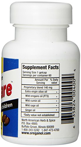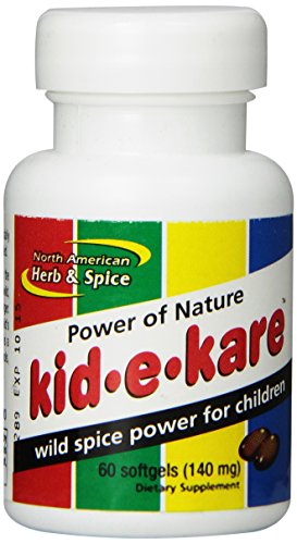 Studio : North American Herb and Spice Publisher : North American Herb and Spice Binding : Health and Beauty Product Description Kid e Kare formula is designed for children. It strengthens immunity and supports the respiratory system. Suggested Use: One or more capsules daily with meals. increase dosage as needed. Ingredients: Proprietary blend of 140 mg. extra virgin olive oil, wild oregano oil(p73), wild cumin oil, wild sage oil, ginger oil. Totally pure edible herbs and spice oils. 0