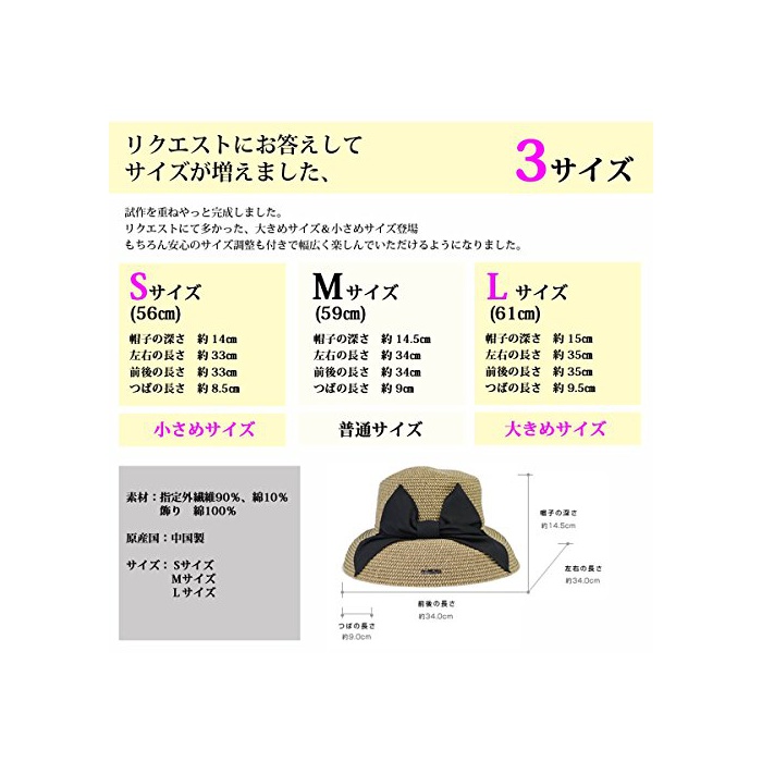 사이즈:S 56cm / M 58cm / L 61cm 큰 사이즈 에게 적합.작은 얼굴 효과 발군.