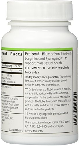 -. Binding : Health and Beauty -. Brand : Herbalife -. EAN : 0882844689371 -. Feature : * Help promote sexual intimacy and pleasure* * Protect blood vessel and circulatory health* * Nutritional support for male sexual health -. IsAdultProduct : 0 -. IsAutographed : 0 -. IsMemorabilia : 0 -. Label : Herbalife -. LegalDisclaimer : These statements have not been evaluated by the Food and Drug Administration (FDA). These products are not meant to diagnose' treat or cure any disease or medical condition. Please consult your doctor before starting any exercise or nutritional supplement program or before using these or any product during pregnancy or if you have a serious medical condition. -. Manufacturer : Herbalife -. Model : 0039 -. MPN : 0039 -. NumberOfItems : 1 -. PackageQuantity : 60 -. PartNumber : 0039 -. ProductGroup : Health and Beauty -. ProductTypeName : HEALTH_PERSONAL_CARE -. Publisher : Herbalife -. ReleaseDate : 2011-11-23 -. Size : 60 Tablets -. Studio : Herbalife -. Title : Herbalife Prelox® Blue (60 tablets), Men's Solutions. -. UPC : 882844689371