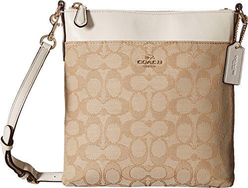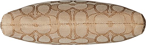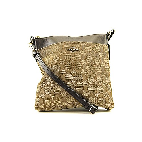 Signature fabric with leather trim. Zip-top closure, fabric lining. Inside multifunction pockets.