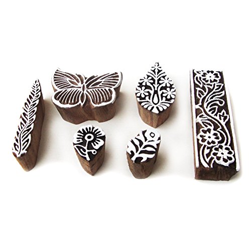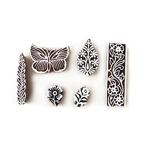 -. Title : Hand Carved Butterfly and Floral Motif Wood Block Stamps (Set of 6)