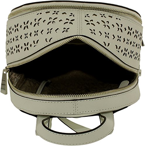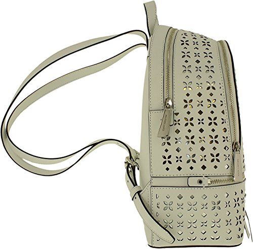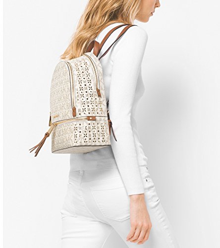 -. Binding : Apparel -. Brand : -. Department : womens -. Feature : MK signature PVC; lining: polyester / Exterior features gold-tone hardware, logo, 2 zip pockets and allover perforation / Interior features lining, 1 zip pocket, 3 slip pockets and 1 key chain / 2"L top handle; 14-1/2"L to 17-1/2"L adjustable backpack straps / Medium sized bag; 13"W x 10-1/2"H x 5"D -. ProductGroup : Shoes -. ProductTypeName : BAG -. Size : Medium -. Title : MICHAEL Rhea Perforated Zip Medium Backpack