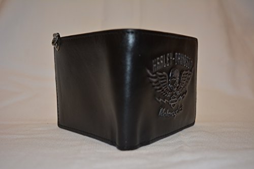 -. Feature : Men's Guardian Tri-Fold Wallet / Made of high-quality black Genuine leather with a smooth texture / Features an awesome distressed winged skull graphic with classic distressed Harley-Davidson® script / Antique nickel finish / Size: 4.5" x 3.5"
