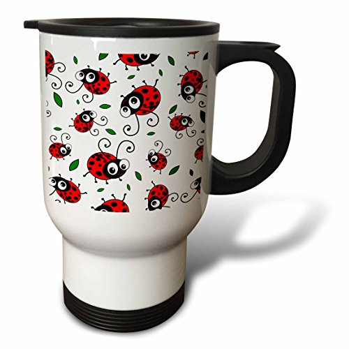 3dRose tm_113184_1 Cute red ladybug pattern with green leaves on white-cartoon ladybugs-ladybirds-kawaii bugs-Travel Mug, 14 oz, Stainless Steel, White