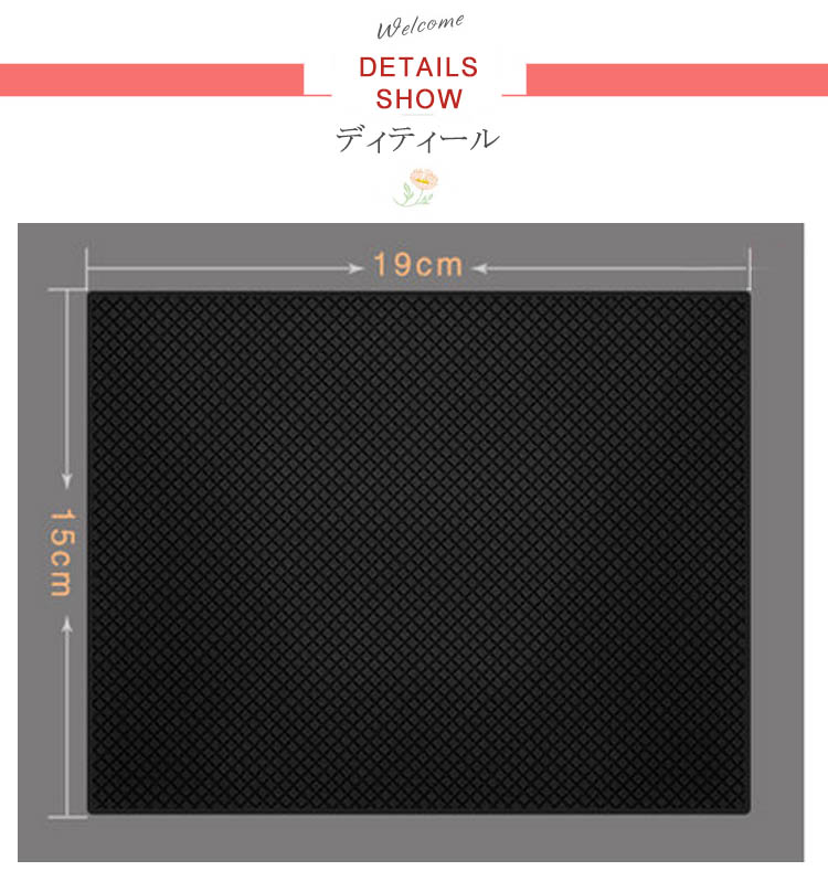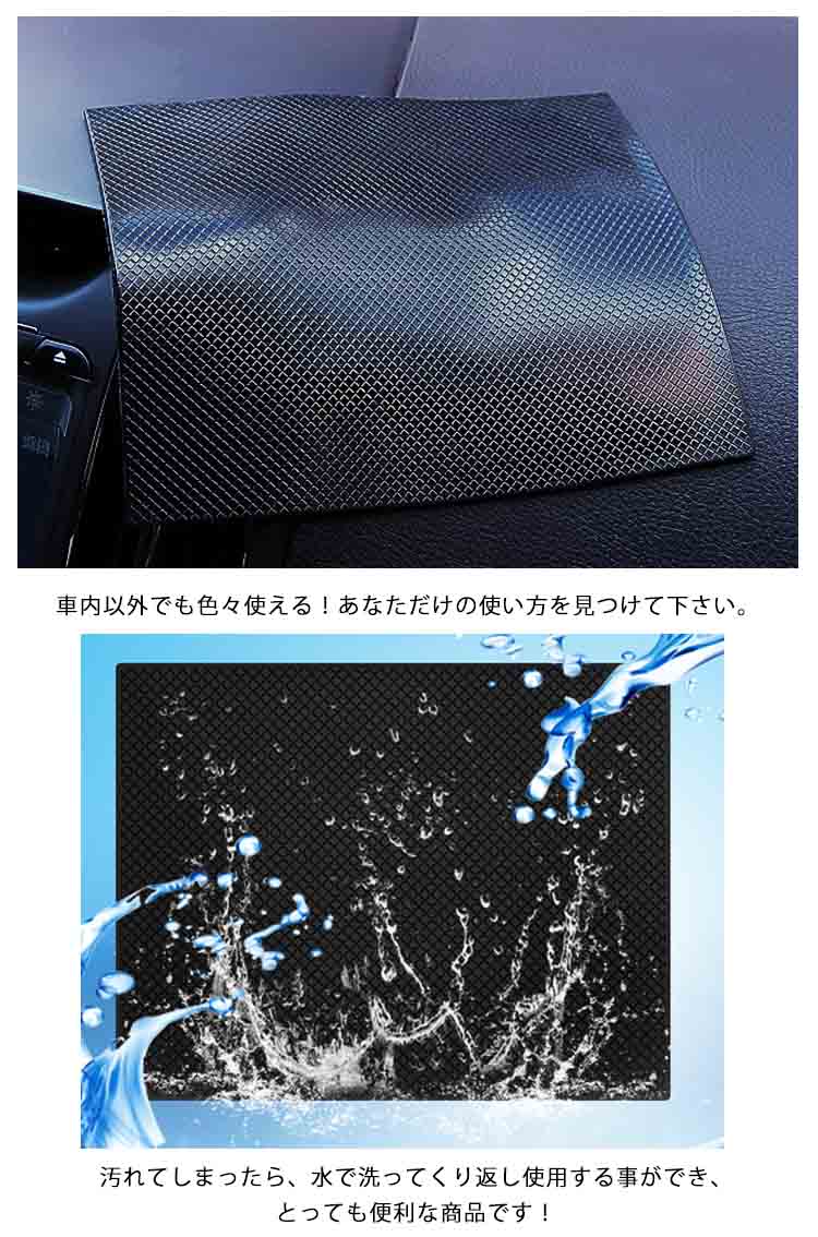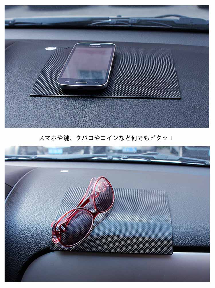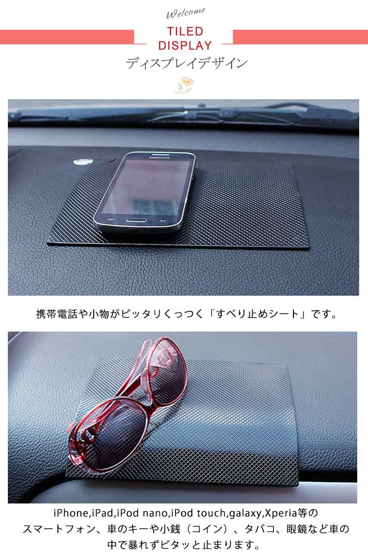 | 携帯電話や小物がピッタリくっつく「すべり止めシート」です。iPhone,iPad,iPod nano,iPod touch,galaxy,Xperia等のスマートフォン、車のキーや小銭(コイン)、タバコ、眼鏡など車の中で暴れずピタッと止まります。車内以外でも色々使える!あなただけの使い方を見つけて下さい。汚れてしまったら、水で洗ってくり返し使用する事ができ、とっても便利な商品です! | |