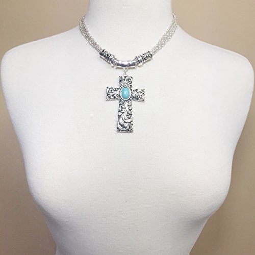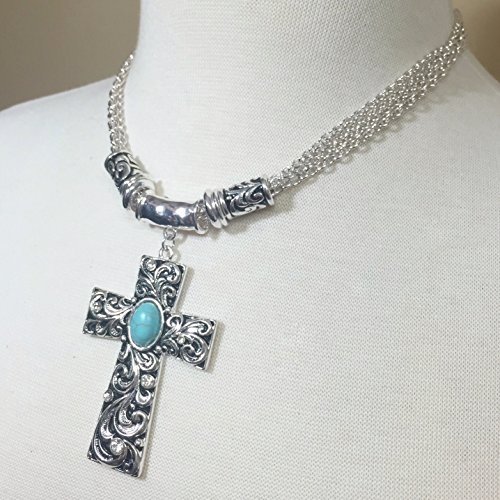Cross with Simulated Turquoise & Rhinestones Western Look Silver Tone Necklace & Dangle Earrings Set (Black Swirl)