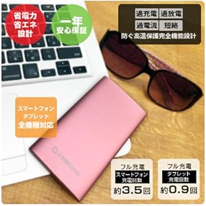 5V充電電圧対応の端末であれば、90%以上対応可能。スマートフォン充電回数約3.5回、タブレット充電回数約0.9回、本体が充電完了後自動的に停止し、過剰充電を防ぐ。モバイル機器への充電完了後自動的に停止し、過剰充電を防ぎ、端末が必要な電力のみ提供し、大切な端末を守る設計。スマートで省電力、省エネ設計なので一年間、未使用でも残存容量は約90% 。