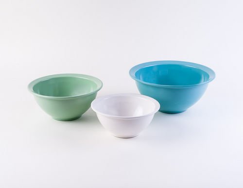 - Add a little mid-century charm to your kitchen with this set of three nesting melamine mixing bowls.