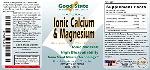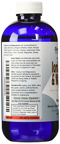 -. Binding : Health and Beauty -. Brand : Good State -. EAN : 0857515003060 -. Feature : Liquid Ionic Calcium and Magnesium / Professional Grade / Natural / Completely Absorbable / Nano Size -. Label : Good State -. Manufacturer : Good State -. Model : 191 -. MPN : 191 -. NumberOfItems : 1 -. PackageQuantity : 1 -. PartNumber : 191 -. ProductGroup : Health and Beauty -. ProductTypeName : HEALTH_PERSONAL_CARE -. PublicationDate : 2014-10-02 -. Publisher : Good State -. Studio : Good State -. Title : Good State Liquid Ionic Calcium and Magnesium Minerals Supplement, 8 Fluid Ounce -. UPC : 857515003060