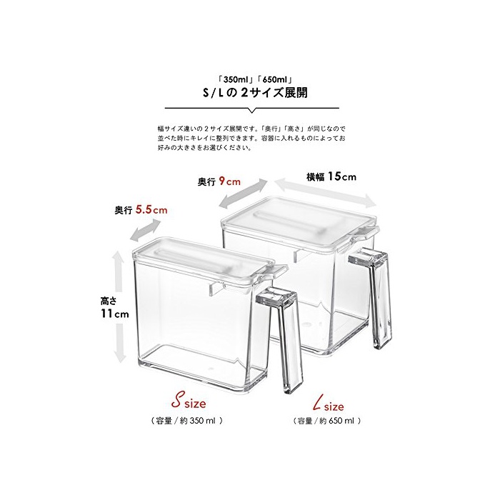 사이즈:[lak]폭18.5×(길이)깊이11.5×높이×13.5cm,내치수:(상단)폭18×(길이)깊이11cm,(하단)폭18×(길이)깊이11×높이11.5㎝고,[조미료 스토커S]폭5.5cm×(길이)깊이15cm×높이11cm,[조미료 스토커L]폭9×(길이)깊이15×높이11cm