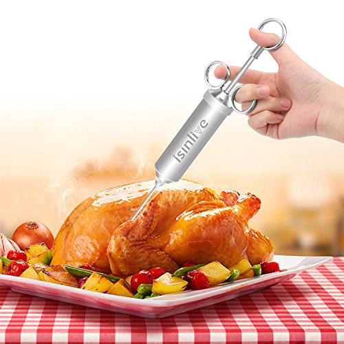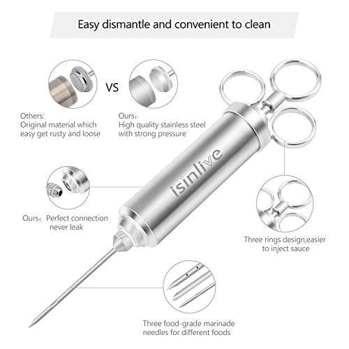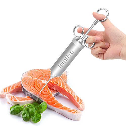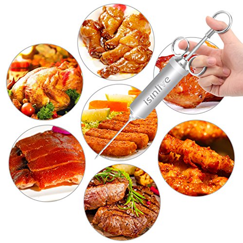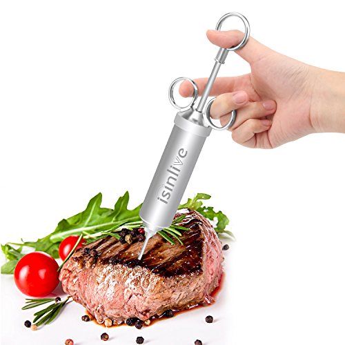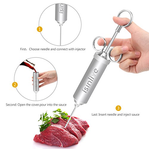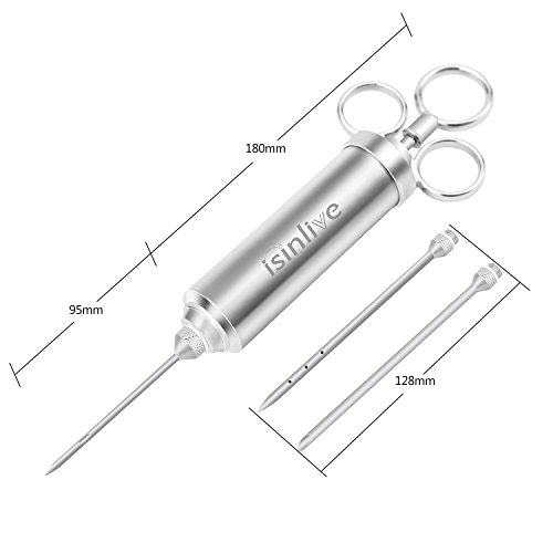 Isinlive Food Injector is made of high quality food-grade stainless steel,it is very durable and stable with strong corrosive resistance,safe and health to use this meat injector.It is very easy to use it marinade meat,only need 3 steps then you can get delicious tasty food.The large storage needle is disassemble then you can easily pour into the sauce.The three rings inject design makes inject easier and comfortable to handle it.As each part could be disassembled so it is convenient to clean the injector syringe.To use this marinade injector kit will speed marinade up,lets the spices get deeper into the meat,any meat will be so juicy and tasty! 0
