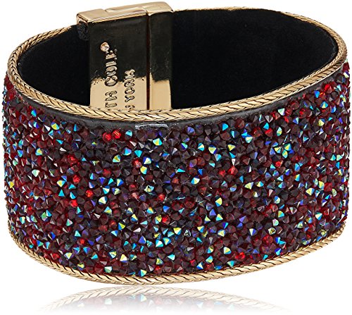 -. Feature : gold tone statement bracelet with red sP.R.Inkle stone and gold hardware featuring a clear CZ element of surP.R.Ise