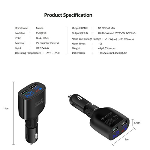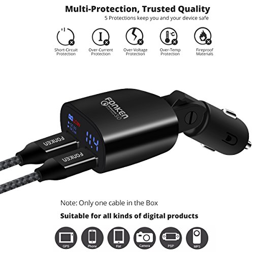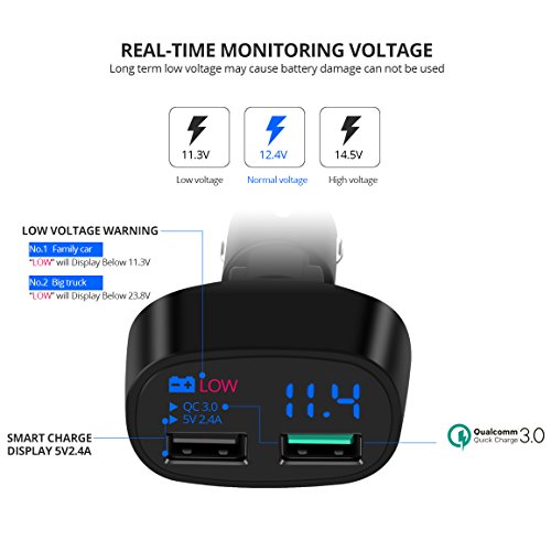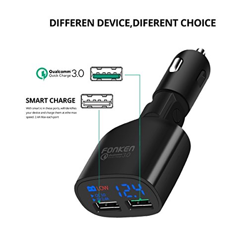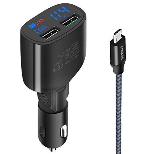 Quick Charge 3.0 USB Car Charger 2-Ports 30W, Fonken LED Car Battery Voltmeter Low Voltage Warning Car Charger Adapter with Smart IC (Black with Micro USB Cable)