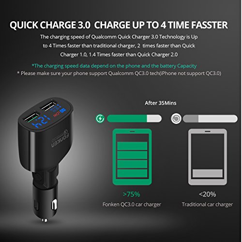 - Dual Ports High Efficiency: Output 5V/2.4A + QC3.0, Quick charge 3.0-World's newest and fastest charging technology, 4 Times faster than traditional charger, 1.4 Times faster than Quick charger 2.0.