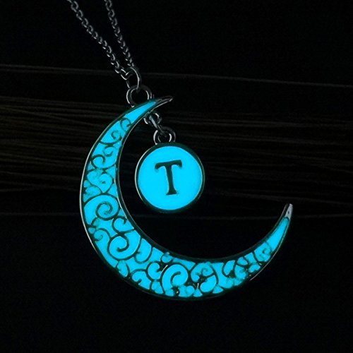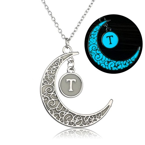 -. Title : Linsh Initial Necklace Glow in Dark Hollow Out Carved Moon T Letter Pendant Necklace Color: Silver