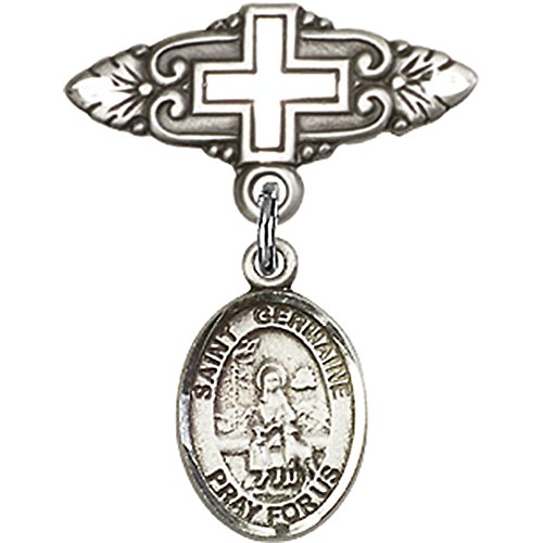 -. Title : Sterling Silver Baby Badge with St. Germaine Cousin Charm and Badge Pin with Cross 1 X 3/4 inches