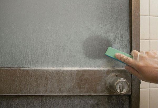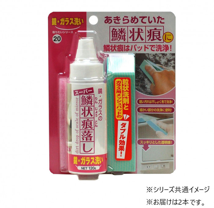 | 粒状洗剤とガラス用メッシュパッドのダブル効果で、あきらめていたガンコな白いうろこ状の汚れ(鱗状痕)を落し、鏡・ガラスにスッキリとした透明感がよみがえります。 |