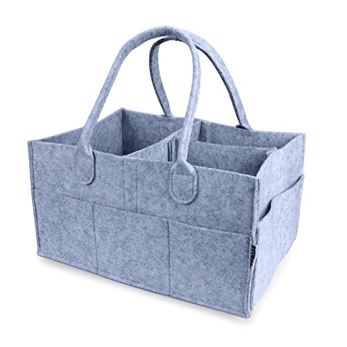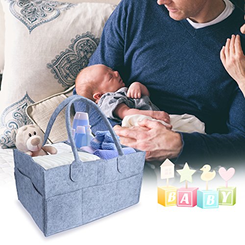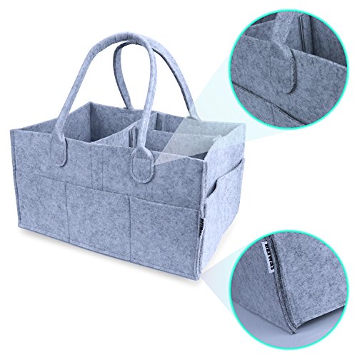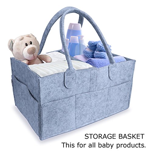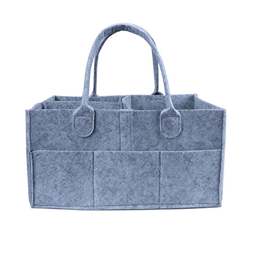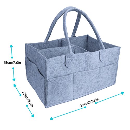 - Practical Storage Basket: The diaper caddy is big and sturdy enough for all baby stuffs. It is 13 x 9 x 7” big and made of soft felt with 8 outside pockets.