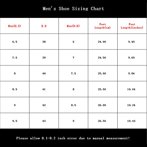 6.5 M US Men suit for Label size 38 fit foot length 9.45 inch. 7.5 M US Men suit for Label size 39 fit foot length 9.65 inch. 8 M US Men suit for Label size 40 fit foot length 9.84 inch. 8.5 M US Men suit for Label size 41 fit foot length 10.04 inch. 9 M US Men suit for Label size 42 fit foot length 10.24 inch. 9.5 M US Men suit for Label size 43 fit foot length 10.43 inch. Notice:Due to manual measurement please allow 0.1-0.2 inch errors. The size chart is not standard size chart please according foot length to select shoes. Please read the size chart carefully. 0