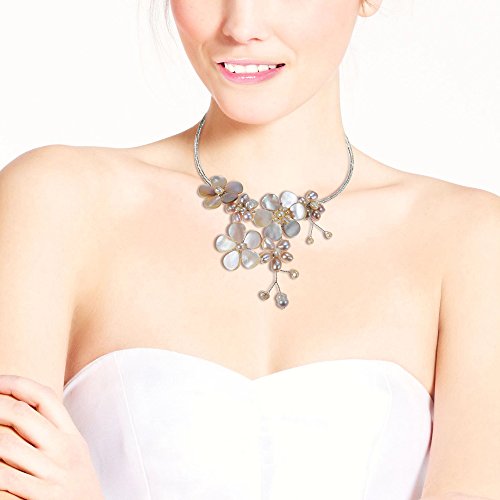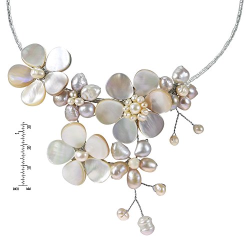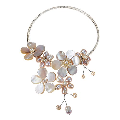 -. Title : Multi Flower Mother of Pearl and Cultured Freshwater Pink Pearl Cluster Choker Wrap Necklace