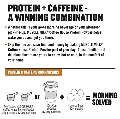 PROTEIN + CAFFEINE - A WINNING COMBINATION. Skip the line and save time and money by making MUSCLE MILK Coffee House Protein Powder part of your day. These familiar and delicious flavors are yours to enjoy, hot or cold, in the comfort of your home.