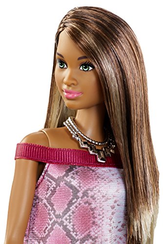 -. Feature : New looks for the Barbie Fashionistas dolls offer real-world diversity and fashion options for endless styling fun! / A wide variety of hair colors, eye colors, skin tones and face shapes reflect today's BFFs. / Each doll wears a fabulous outfit with super style. / Barbie Fashionistas doll looks "pretty in python" with a pink off-the-shoulder dress with python print and ruffle hem. / Matching strappy booties are the perfect complement.