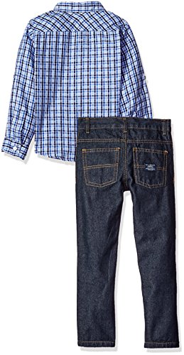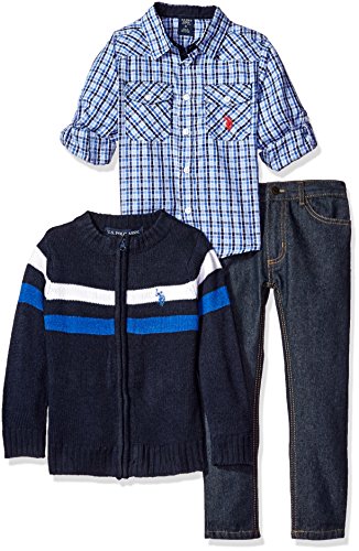 Long sleeve two flap chest pocket plaid woven sport shirt, chest and collar striped sweater jacket and 5 pocket denim jean