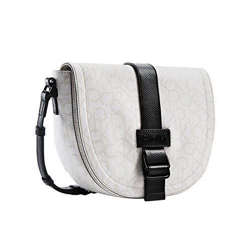 -. Feature : crossbody saddle bag / allover monogram P.R.Int + textured logo fabric, coated and water resistant / leather trim, magnetic snap flap closure, adjustable strap, front logo plaque + metal buckle detailing / back open pocket, interior zip pocket, open pocket + card slot, fully lined / Dimensions: 11" wide x 8.25" tall x 3.5" deep, 21" shoulder drop
