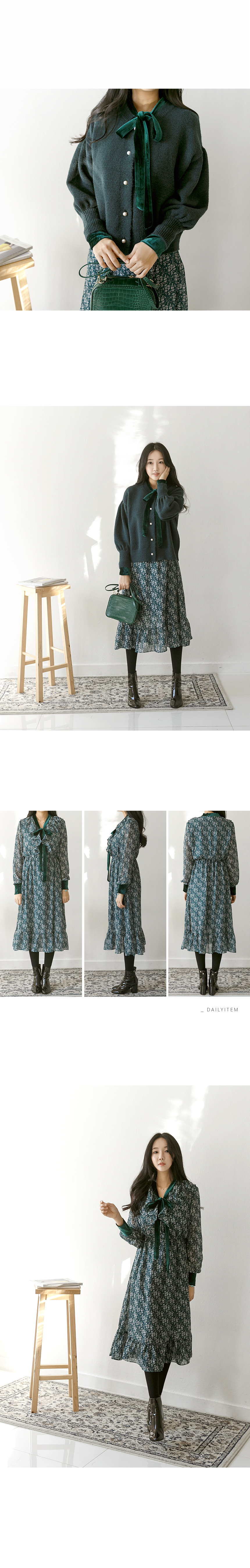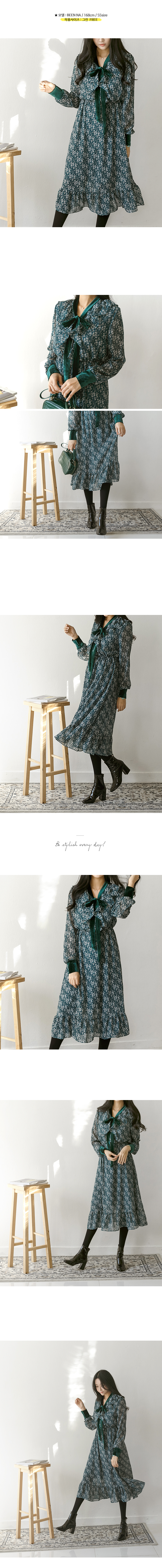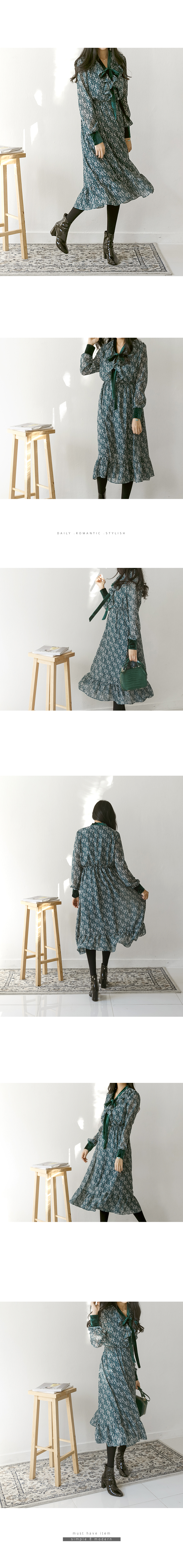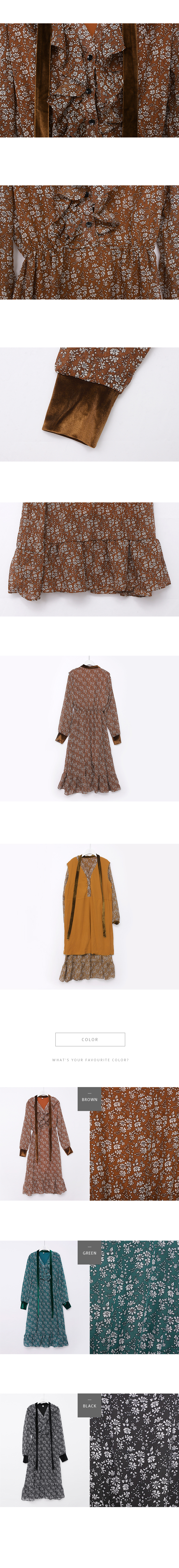 목선과 소맷단에 벨벳 포인트를 줘 고급스러운 프릴 롱 원피스예요.