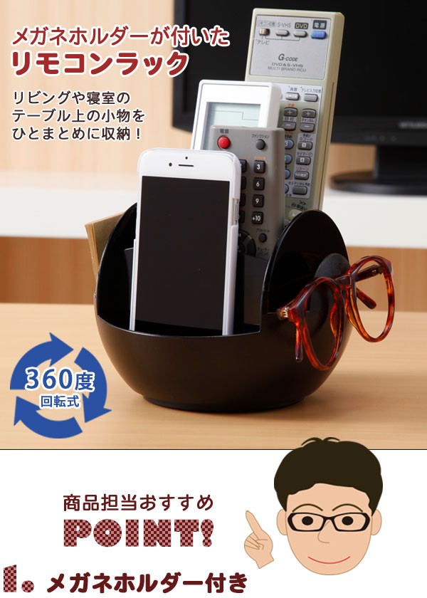 | 散らかりがちなテーブル上の小物をひとまとめに収納できるリモコンスタンド。本体サイドにメガネホルダーを付けたので、レンズを傷つけずに保管できます。老眼鏡や自宅用メガネなどの定位置に。スマホ置きとしても。本体が360度回転するのでどこからでも出し入れしやすい!6つの仕切りで入れる物のサイズに合わせてスッキリ収納できます。卓上がきれいに片付き、毎回探す手間も省けます。 |