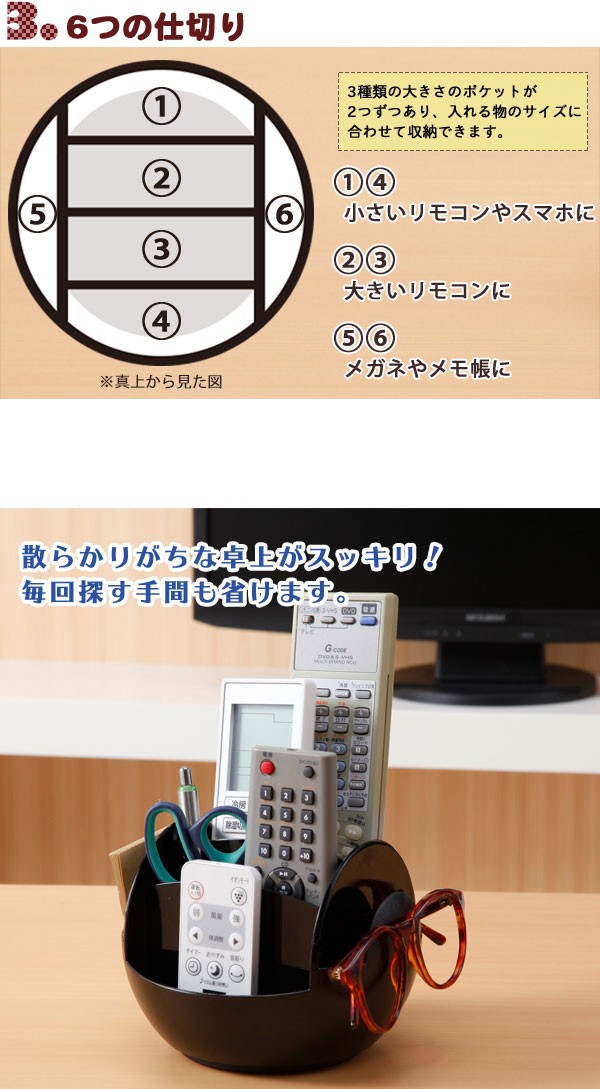 | <h1>散らかりがちなテーブル上の小物をひとまとめに収納できるリモコンラック。本体サイドにメガネホルダーを付けたので、レンズを傷つけずに保管できます。老眼鏡や自宅用メガネなどの定位置に。本体が360度回転するのでどこからでも出し入れしやすい!6つの仕切りで入れる物のサイズに合わせてスッキリ収納。リモコンスタンド/リモコン収納/リモコン立て/リモコンホルダー/スマホ置き/回転式/小物入れ/収納ボックス/</h1> |