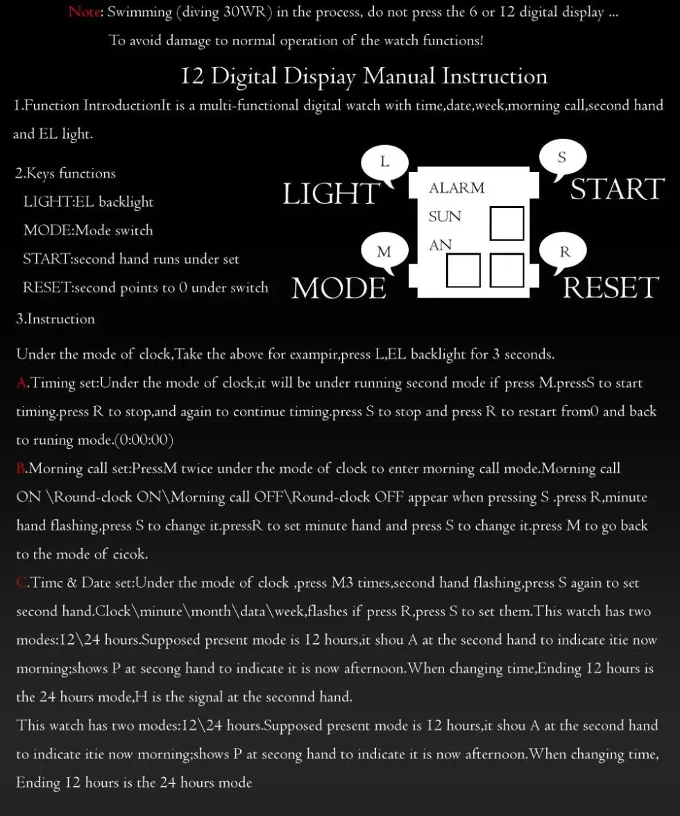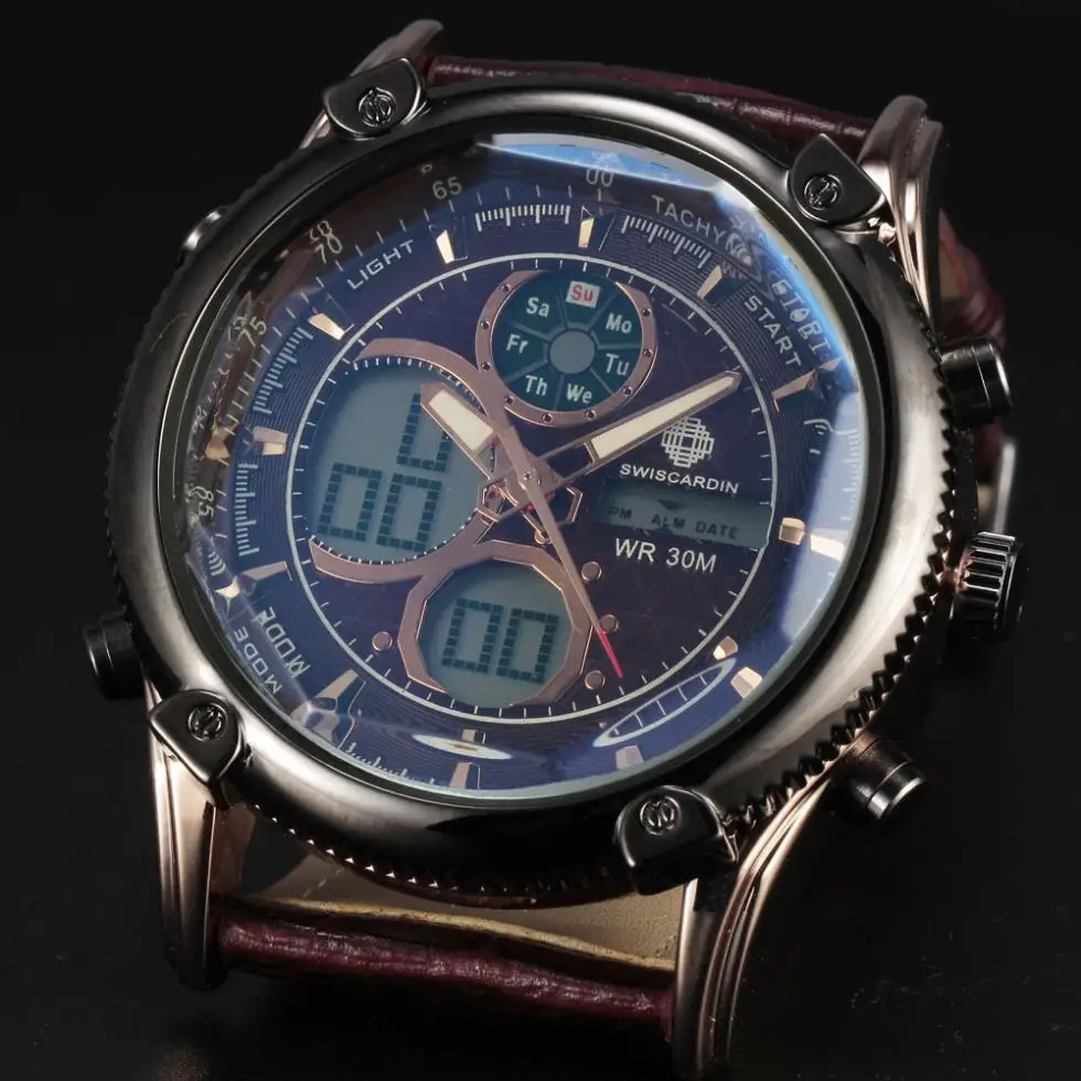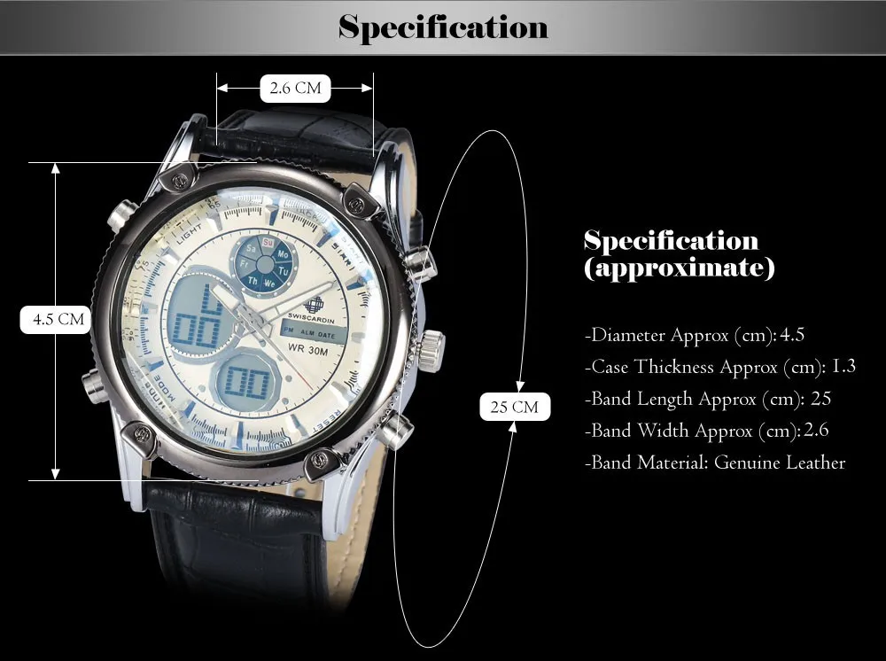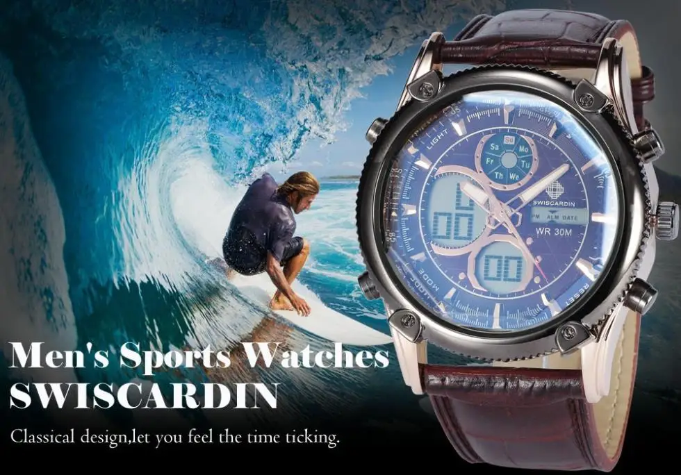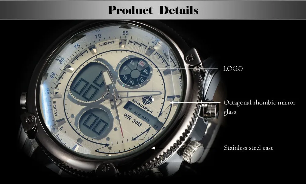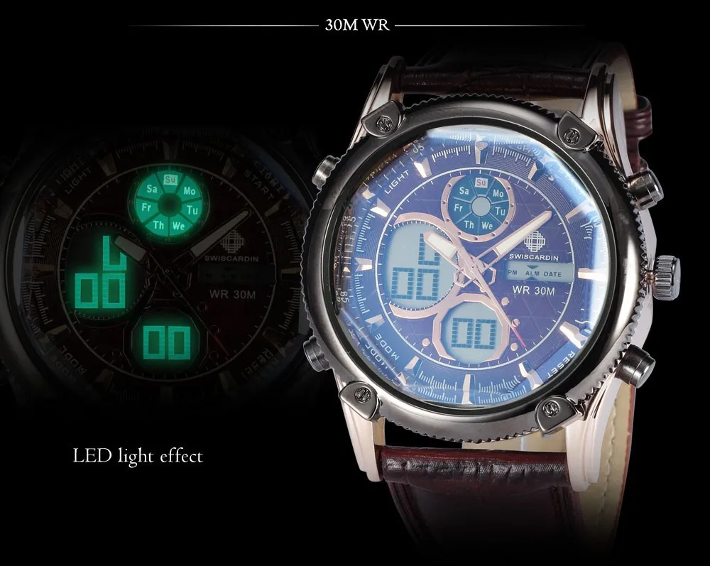 Feature:Auto Date,Alarm,Water Resistant,Complete Calendar,Stop Watch,Diver,Multiple Time Zone,LED display